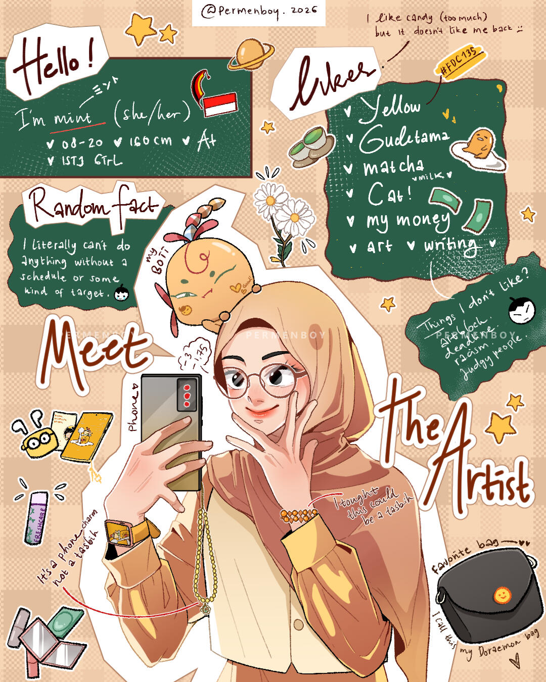 Hi! I'm Mint, a freelance illustrator from Indonesia who's all about candy and yellow vibes! I'm love drawing anime-style stuff, but honestly, I'm into a lot of random things.A~ and I'm an ISTJ girl who can be kinda emotional sometimes!